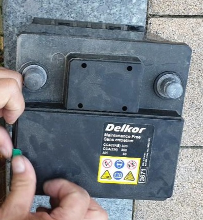 참고로 새 배터리 왼쪽의 동그란 플라스틱 부분을 보시면 초록색으로 보이실 텐데