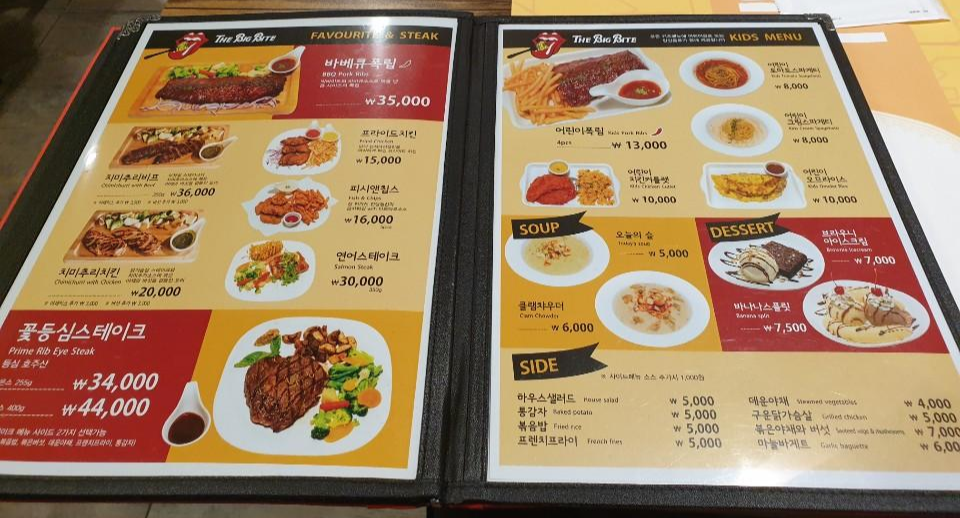 안정리 맛집 더 빅 바이트의 쨍한 오렌지 컬러 메뉴판도 너무 예쁘져~?
